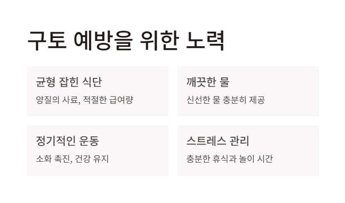 • 균형 잡힌 식단: 양질의 사료를 급여하고, 급여량을 조절합니다.