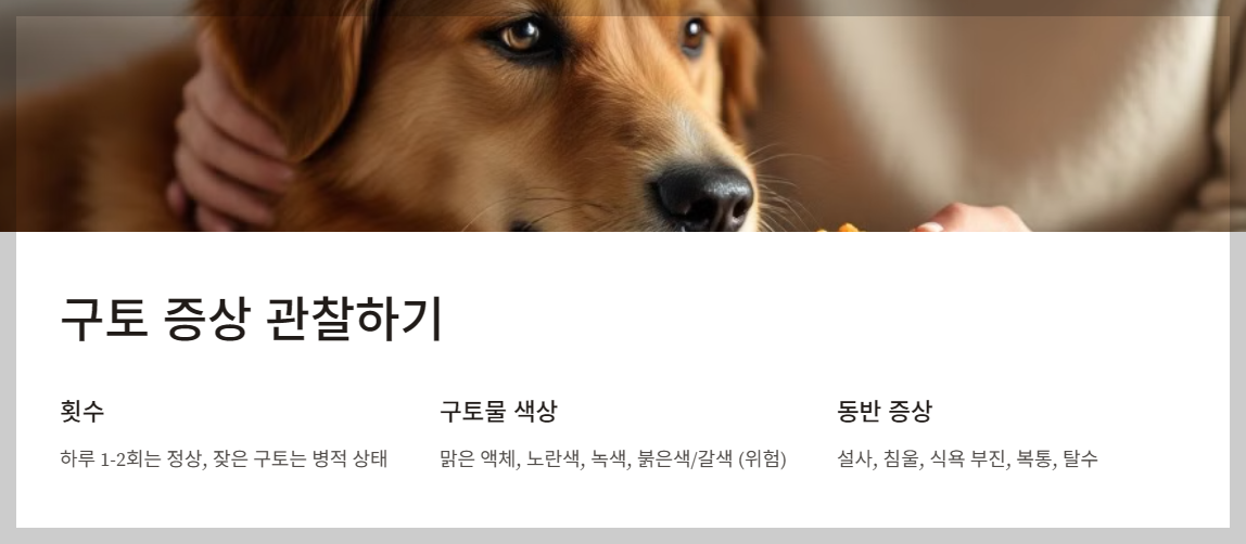 • 횟수: 하루에 한두 번 정도의 구토는 크게 문제가 되지 않지만, 잦은 구토는 병적인 상태를 의심해야 합니다.