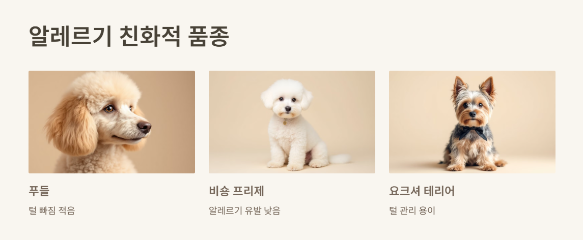 - 알레르기 친화적인 품종 선택: 털이 적거나 털 빠짐이 적은 품종을 선택합니다. (푸들, 비숑 프리제, 요크셔 테리어 등)
