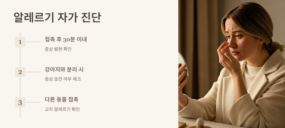 - 강아지와 접촉 후 30분 이내에 위에서 언급한 증상들이 나타나는지 확인합니다.