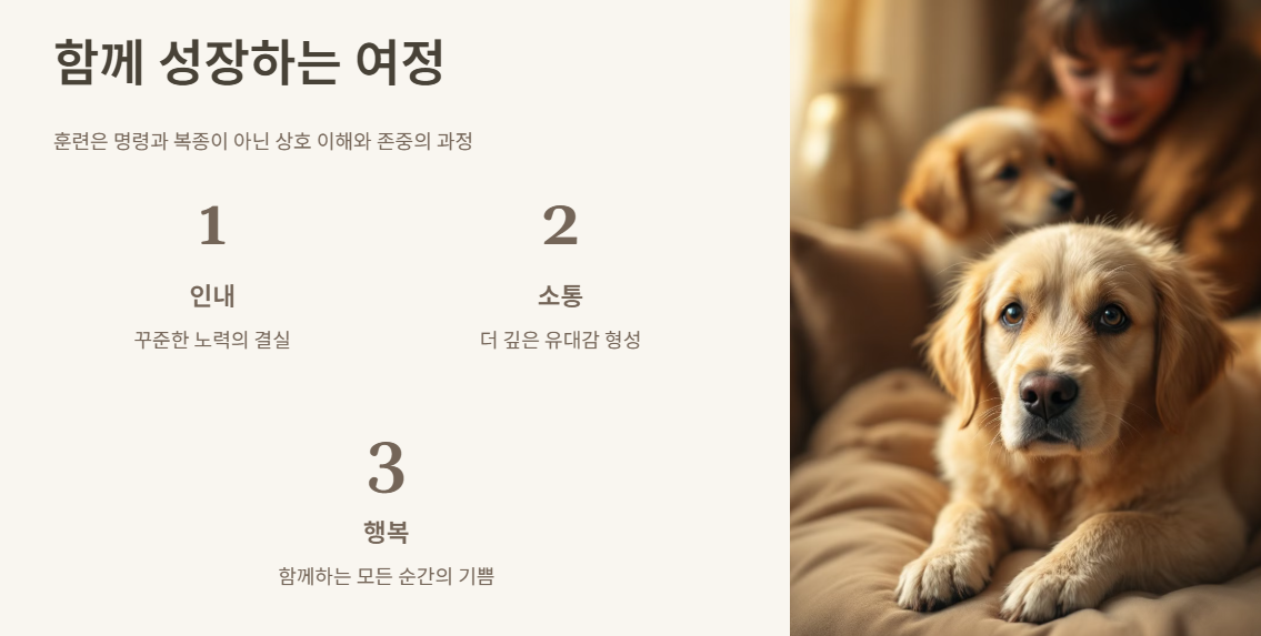 반려견과의 관계는 단순히 명령과 복종이 아니라, 서로를 이해하고 존중하는 과정입니다. 훈련을 통해 반려견과의 유대감을 더욱 깊게 하고, 함께하는 모든 순간이 행복으로 가득 차길 바랍니다.