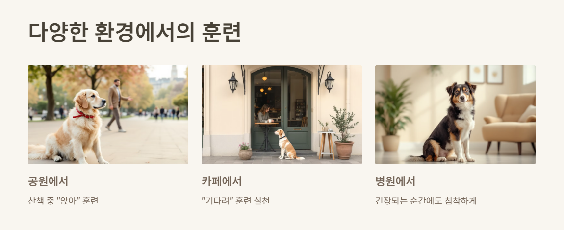 - 집 안에서 훈련이 익숙해지면, 산책이나 공공장소 등 다양한 환경에서 "기다려" 훈련을 실시합니다.