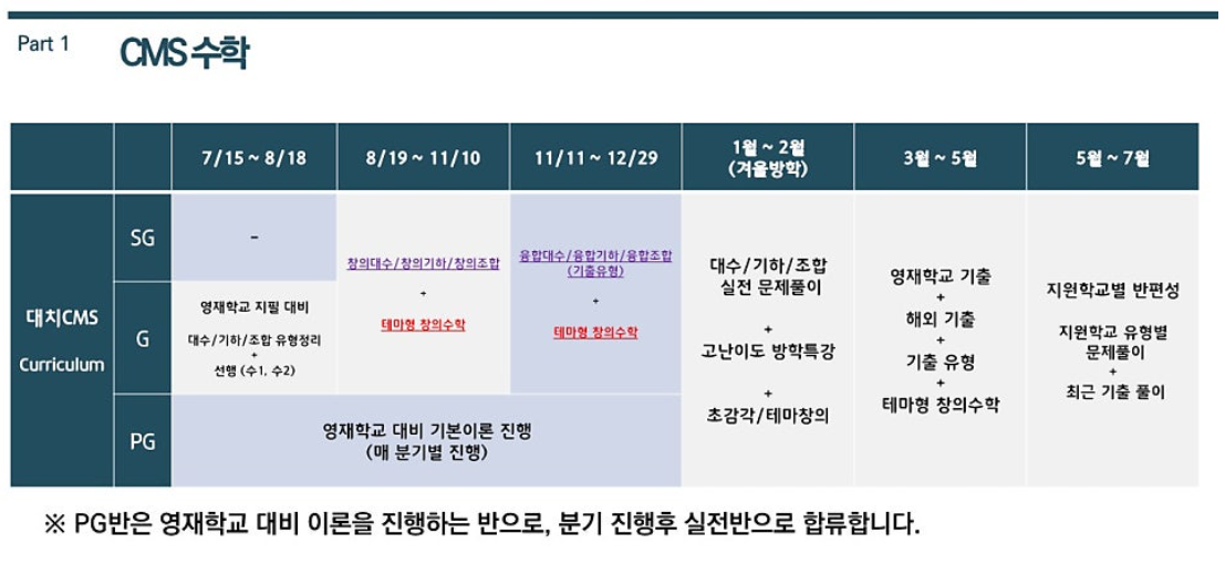 대치동의 대표적인 영재학교 대비 수학학원인 CMS와 올림피아드의 커리큘럼을 소개해 드릴게요. CMS는 중2 여름방학부터, 올림피아드는 중2 6월부터 1년 커리큘럼이 시작되어요. 하지만, 기본적으로 영재 대비반 입반 자체가 쉽지 않기 때문에 고등 선행과 중등 심화를 탄탄히 하면 좋아요.