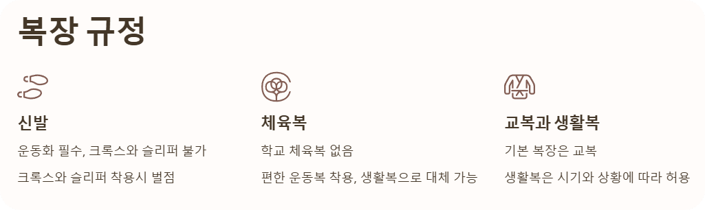 학교와 학생회의 공식적인 입장은 생활복은 등교 시 교복으로 인정되지 않는다고 공고해요. 체육 시간 외에는 반드시 교복을 입게 하는 담임 선생님도 계시고, 본인 수업 시간에는 꼭 교복 입도록 하시는 교과 선생님도 계세요. 하지만, 보통은 생활복을 입는 것에 대해 크게 제지하지 않아요. 교복보다 자주 입으니, 여유있게 준비하시면 좋아요.