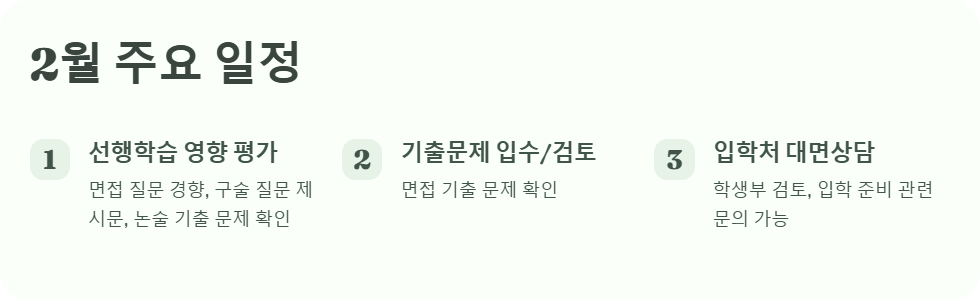 * 2026학년도 수시 요강 대학별 입시설명회 논술 대비 시작 * 면접 대비 시작 * 2025학년도 대입 결과 검토 |